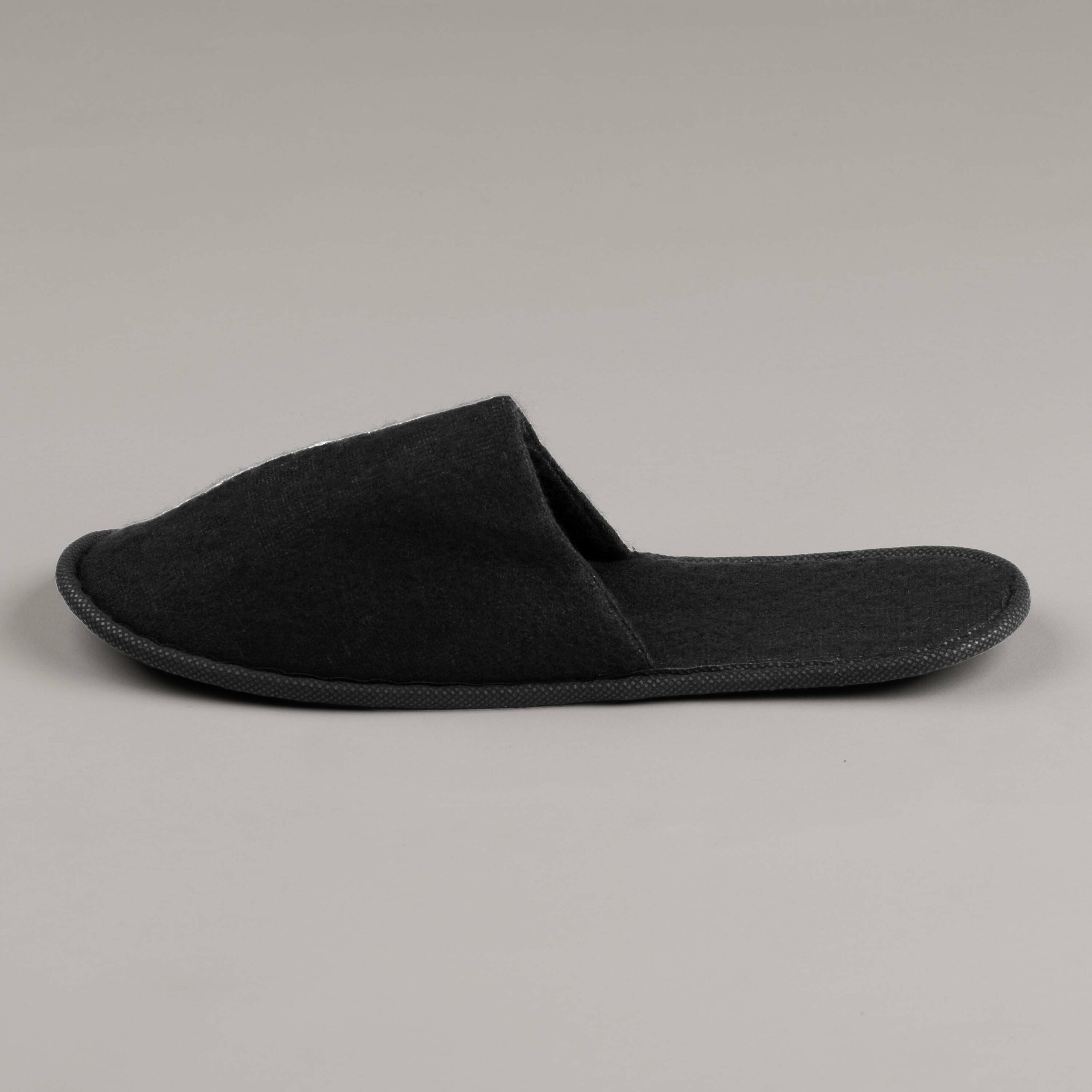 Černé jednorázové pantofle jsou dostupné v univerzální velikosti a dodají každému hotelovému nebo wellnes zařízení nádech luxusu. Na přání je možné opatřit pantofle výšivkou nebo potiskem. Minimální objednávka logovaných pantoflí činí alespoň 3000 párů.