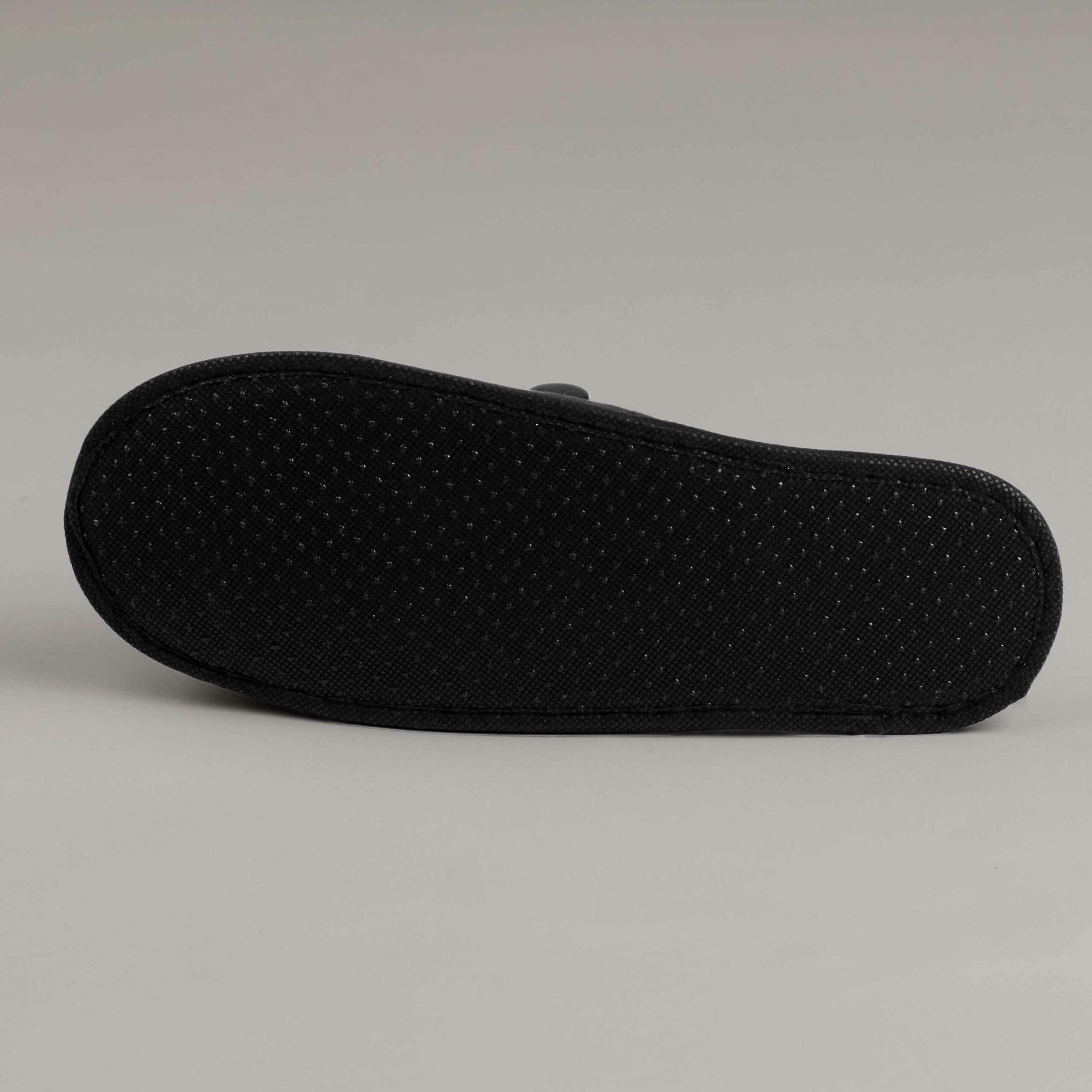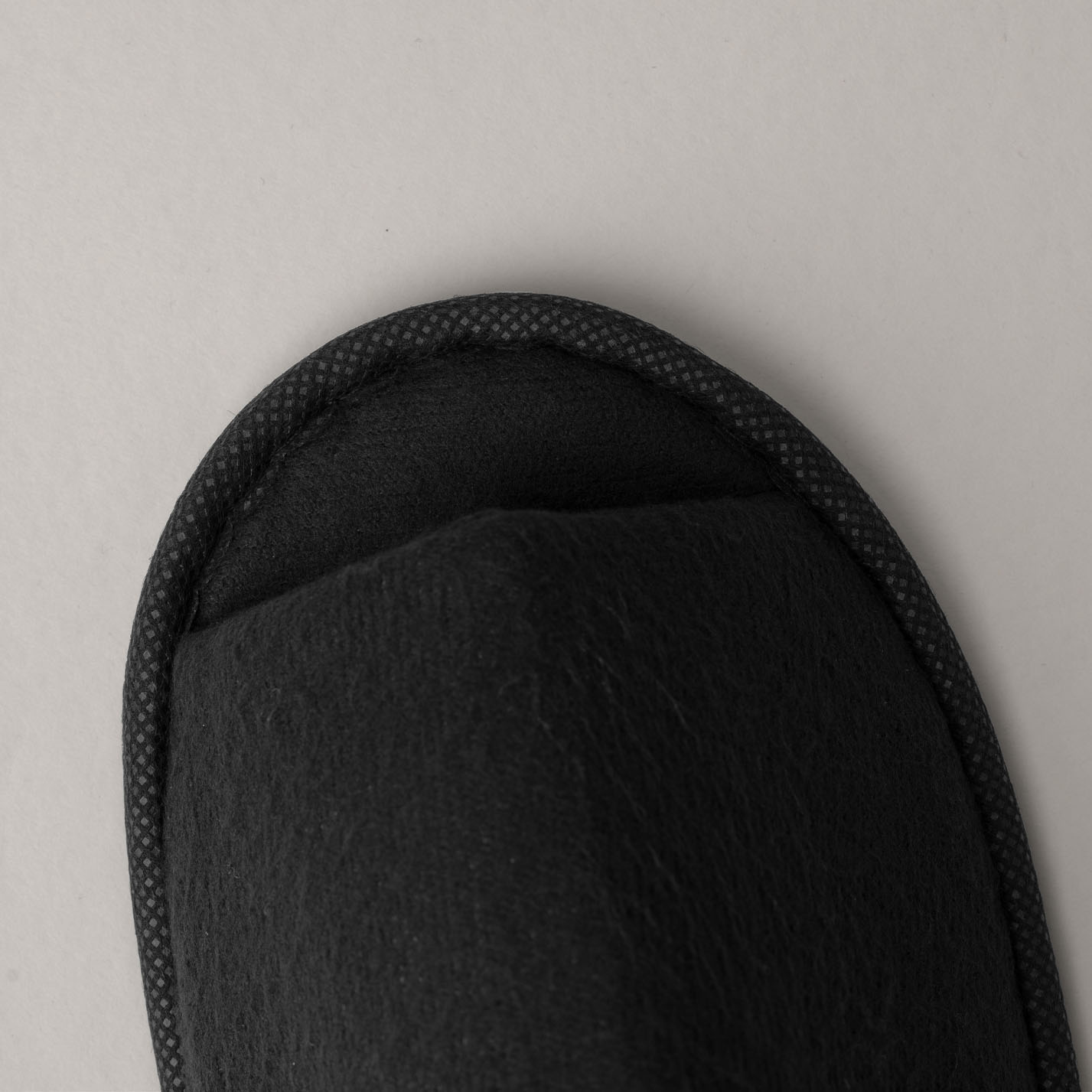 Černé jednorázové pantofle jsou dostupné v univerzální velikosti a dodají každému hotelovému nebo wellnes zařízení nádech luxusu. Na přání je možné opatřit pantofle výšivkou nebo potiskem. Minimální objednávka logovaných pantoflí činí alespoň 3000 párů.