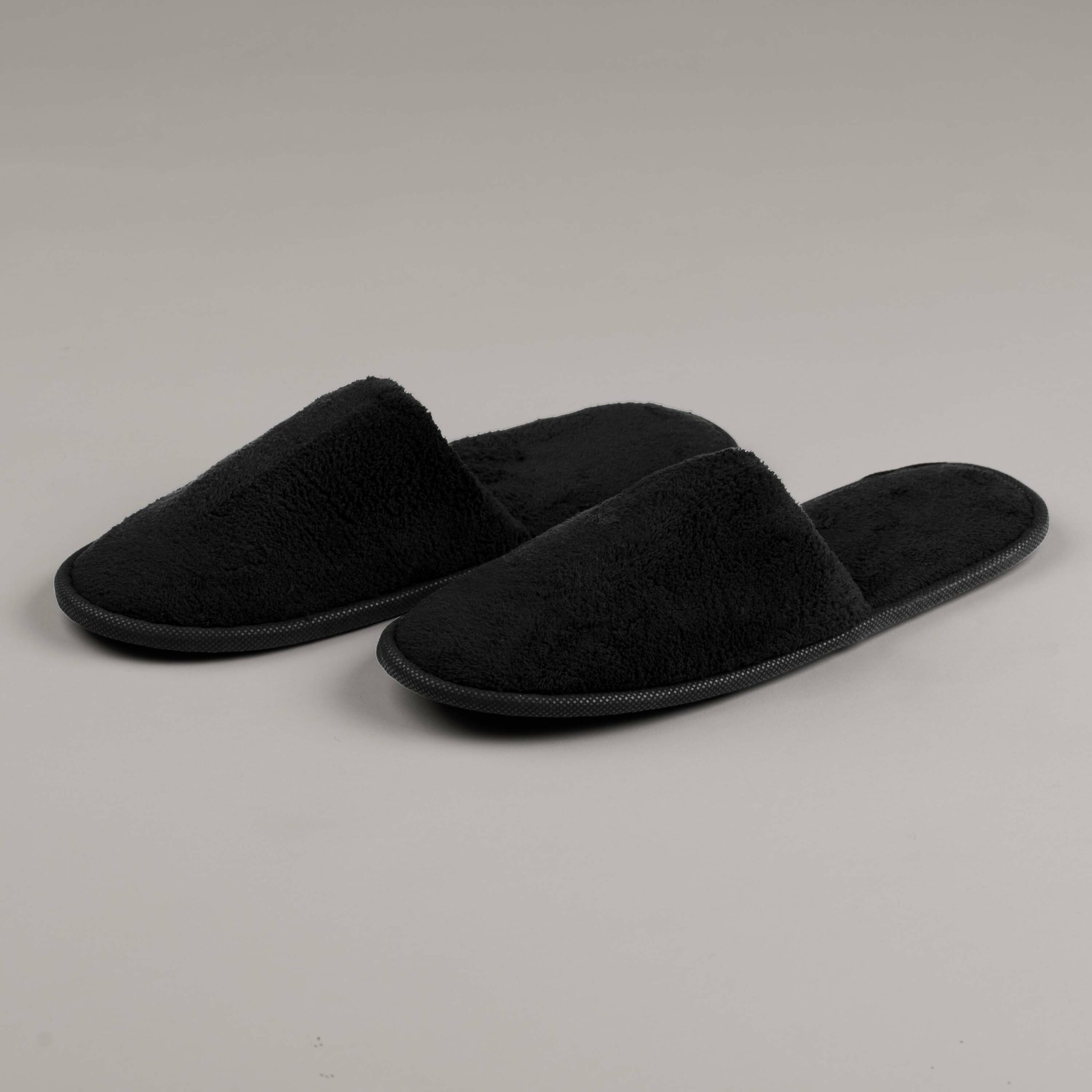 Pantofle v černé barvě mají zavřenou špičku, univerzální velikost a bezpečnou protiskluzovou podrážku.