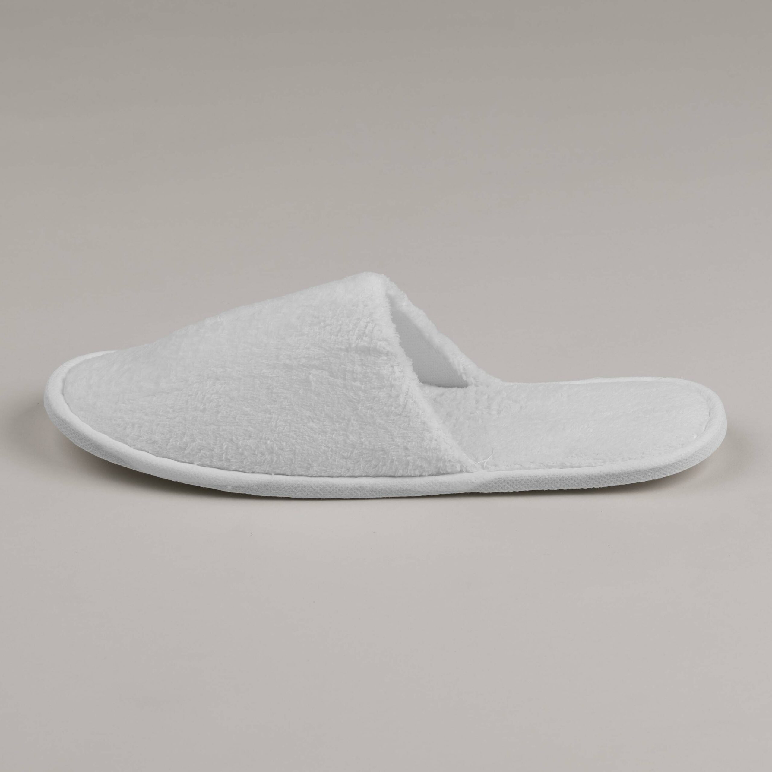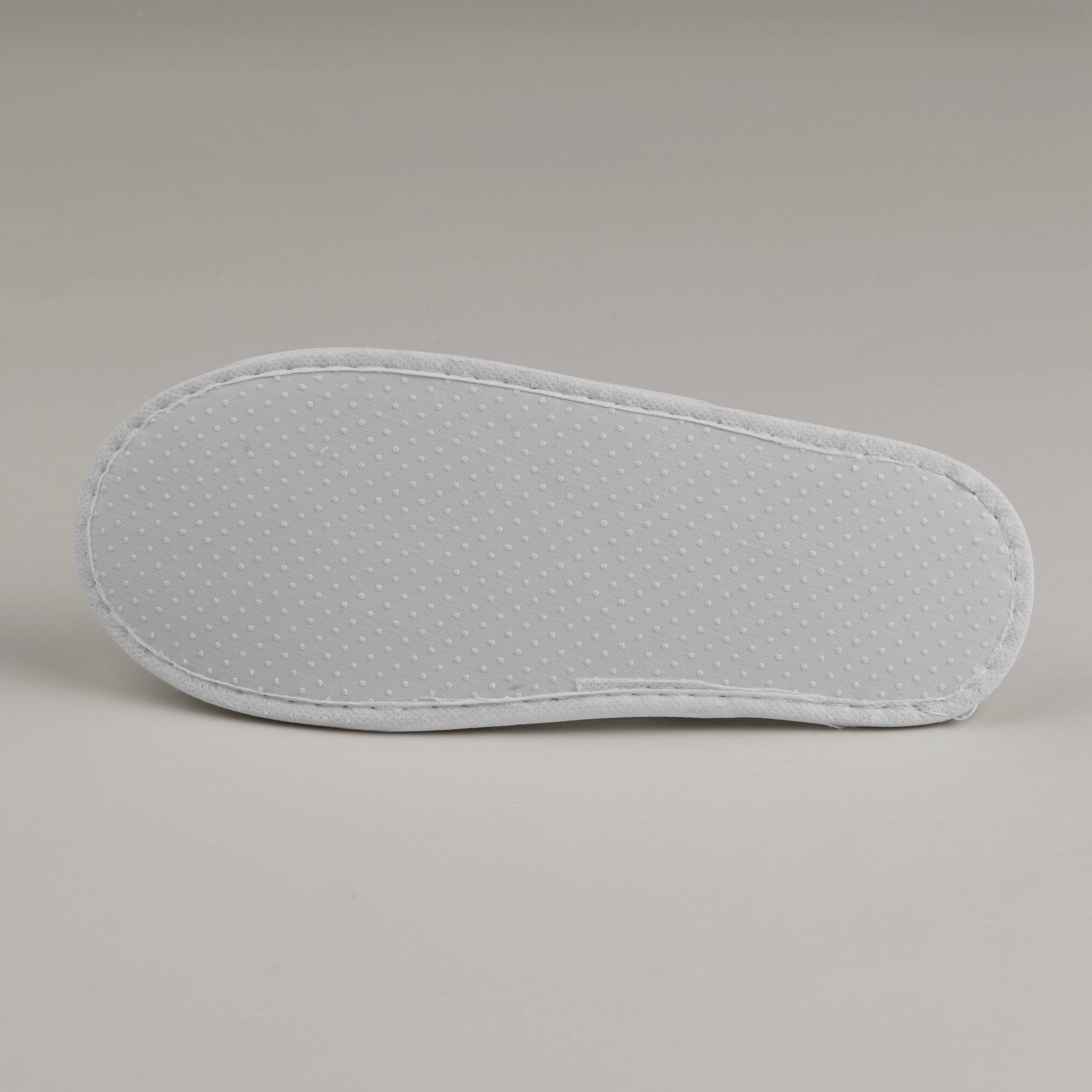 Pantofle v bílé barvě mají zavřenou špičku, univerzální velikost a bezpečnou protiskluzovou podrážku.