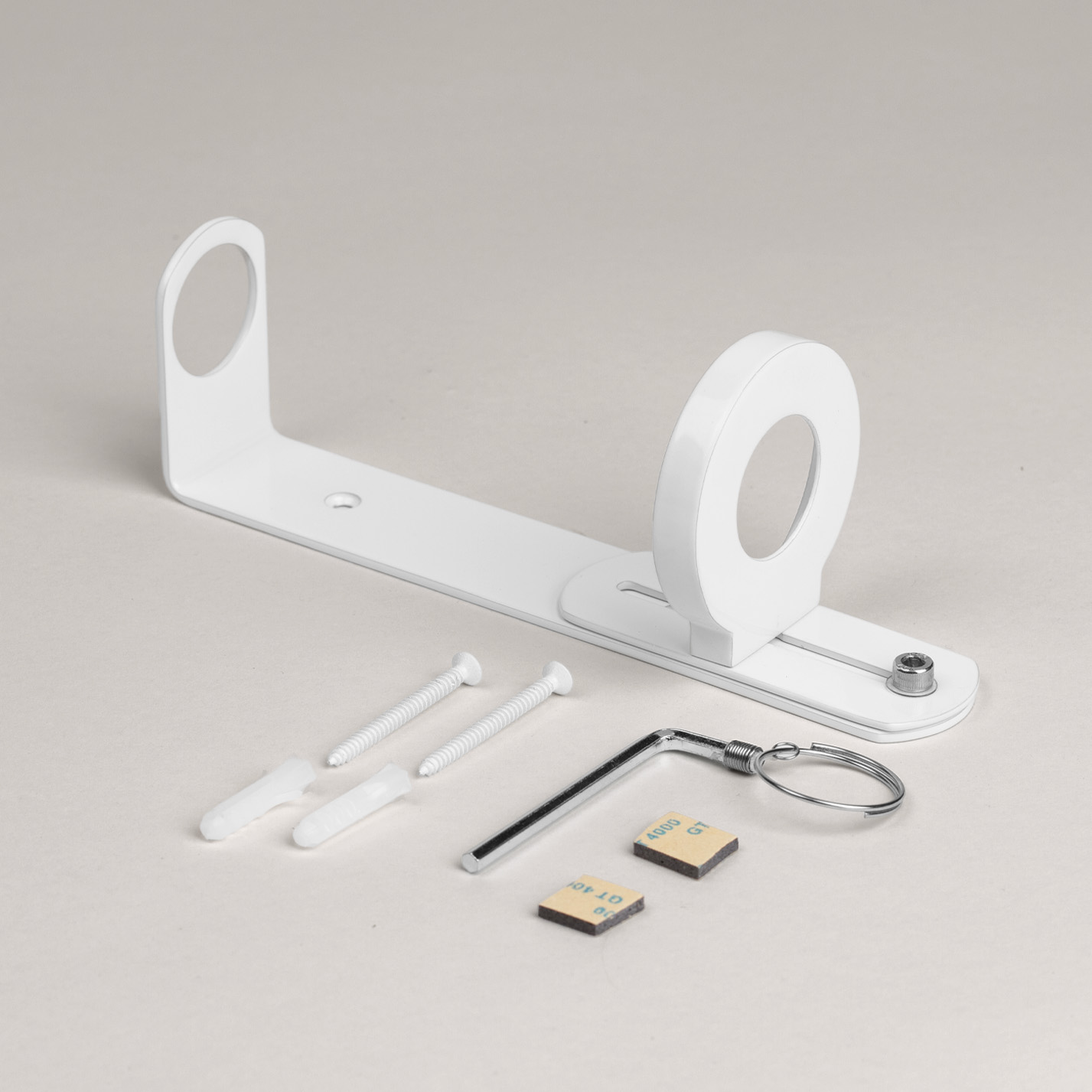 Vysoce kvalitní nerezová ocel s práškovým lakováním zaručuje odolnost vůči vlhkosti a korozi. Držák lze snadno upevnit pomocí dodávaného montážního příslušenství – vrutů, hmoždinek a imbusového klíče. Součástí balení jsou i samolepicí podložky pro stabilní a čistou instalaci.