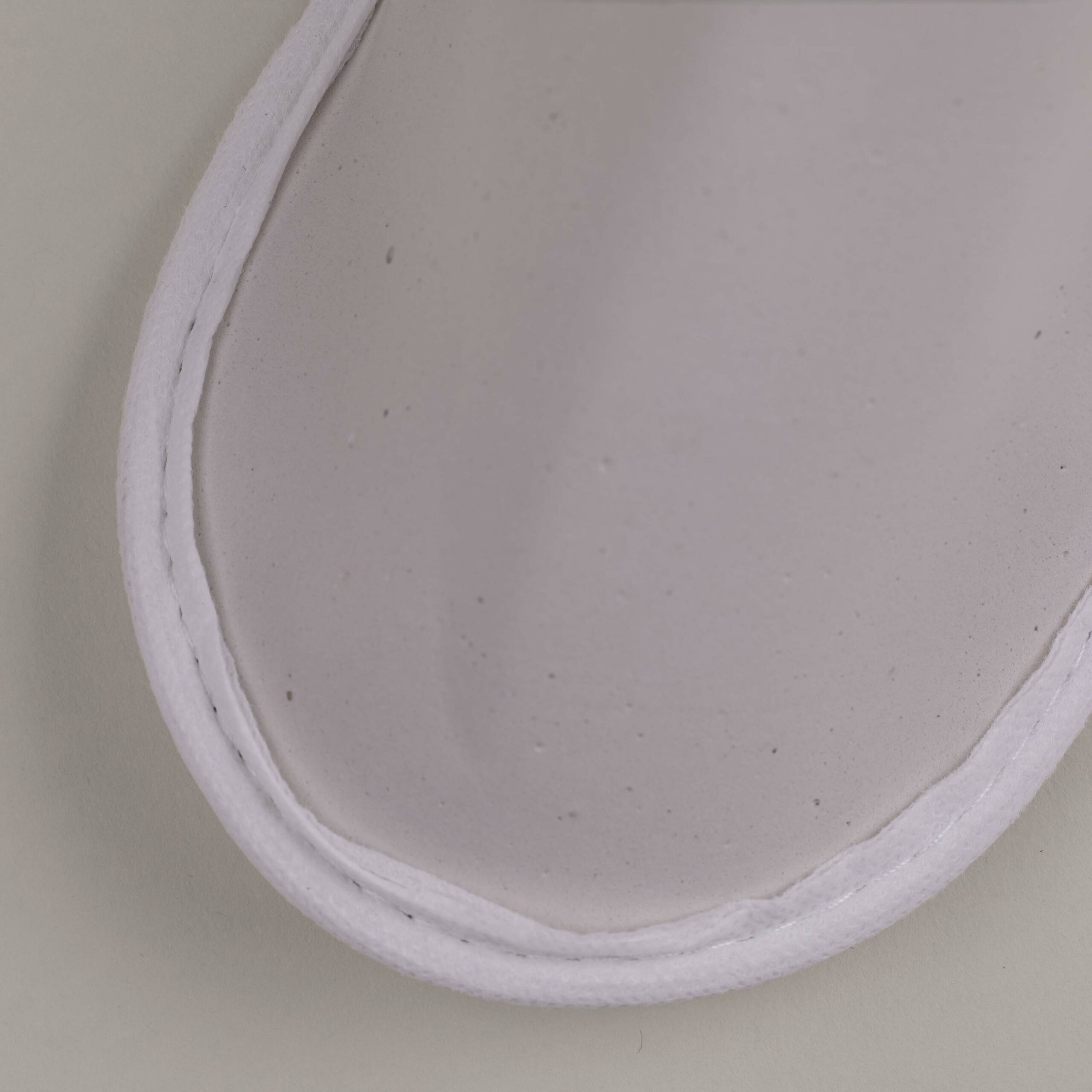 Bílé pantofle mají zavřenou špičku, univerzální velikost a podrážku o tloušťce 3 mm. Jsou vyrobené z voděodolného a rychleschnoucího materiálu EVA.