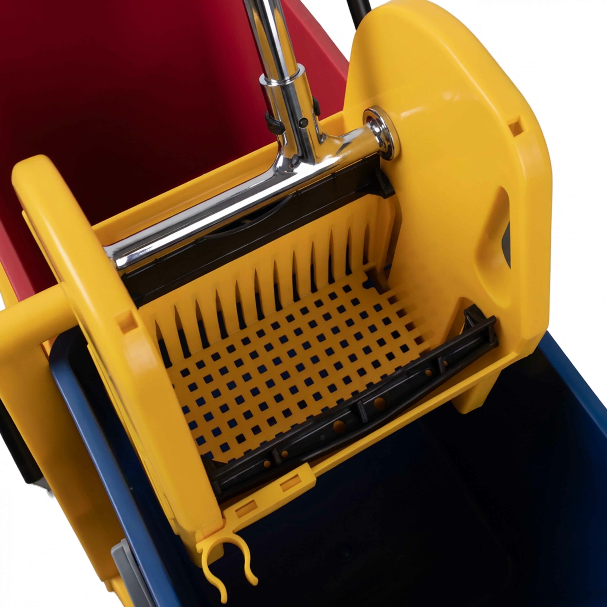 Vozík je vybaven robustním mechanickým ždímačem mopů, který usnadňuje práci a minimalizuje fyzickou námahu obsluhy. Pevná konstrukce z odolných plastových a kovových prvků zajišťuje dlouhou životnost i při intenzivním provozu.