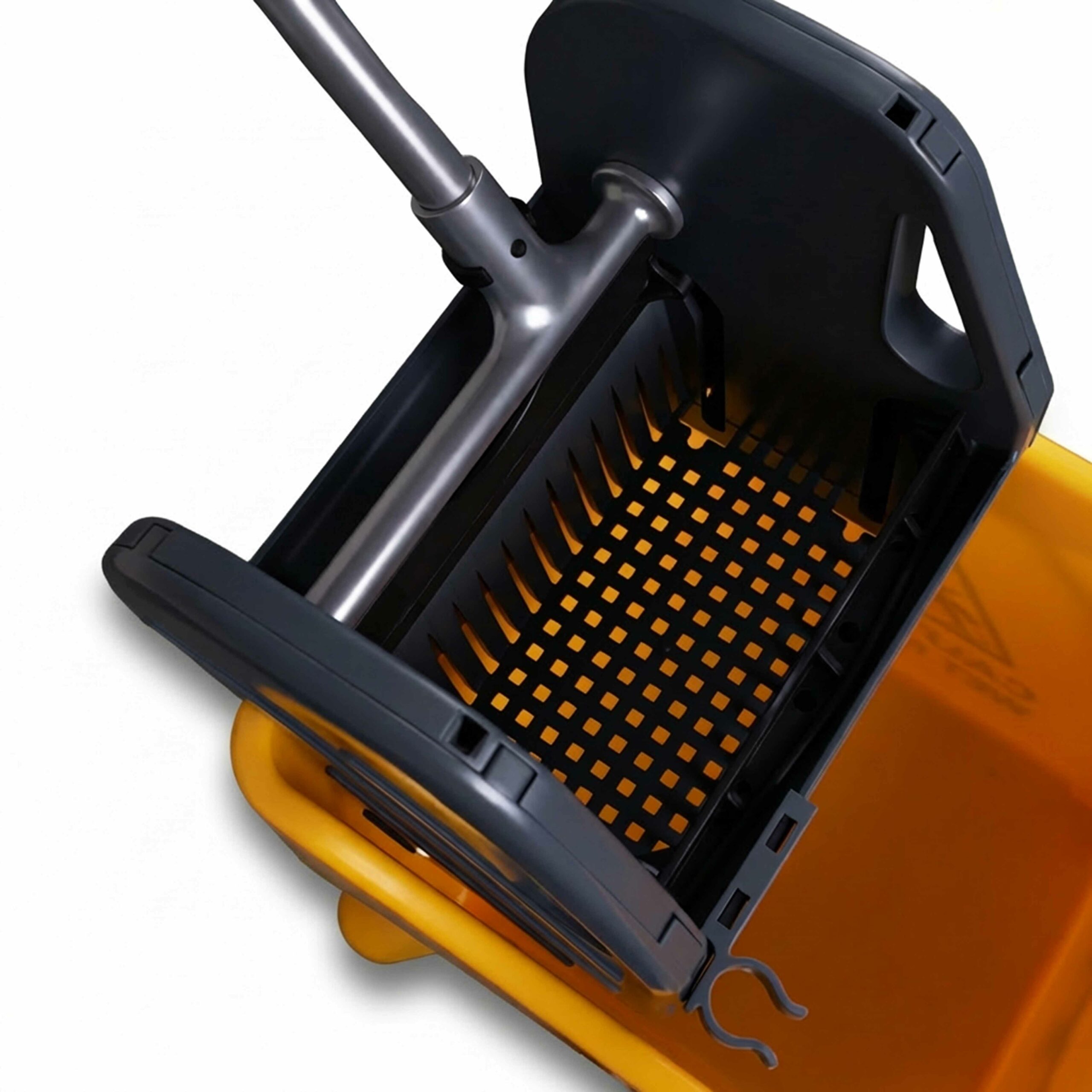 Robustní ždímač zajišťuje pohodlné vyždímání mopů bez nadměrné fyzické námahy a přispívá k hygienickému úklidu. Stabilní kbelík je usazen na pevné základně s otočnými kolečky, která umožňují plynulý pohyb vozíku po místnosti.